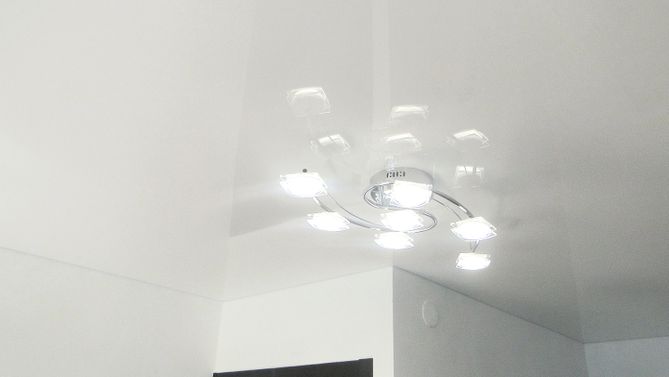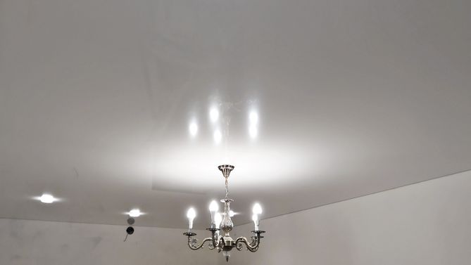 Бесшовный глянцевый натяжной потолок в гостиную 15,6 м2