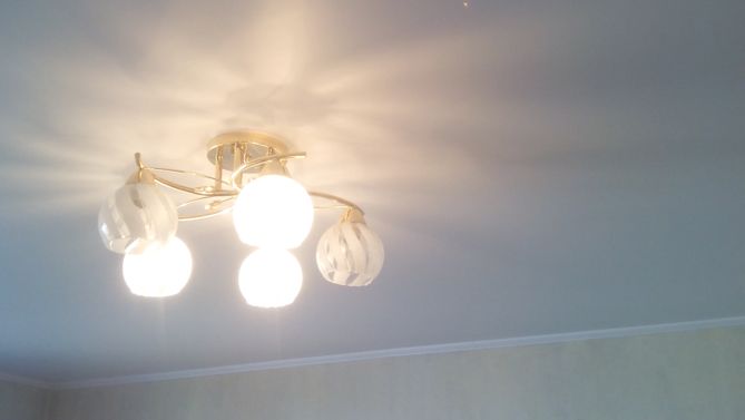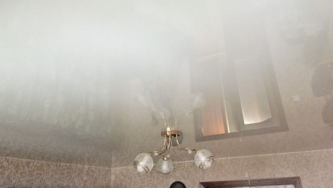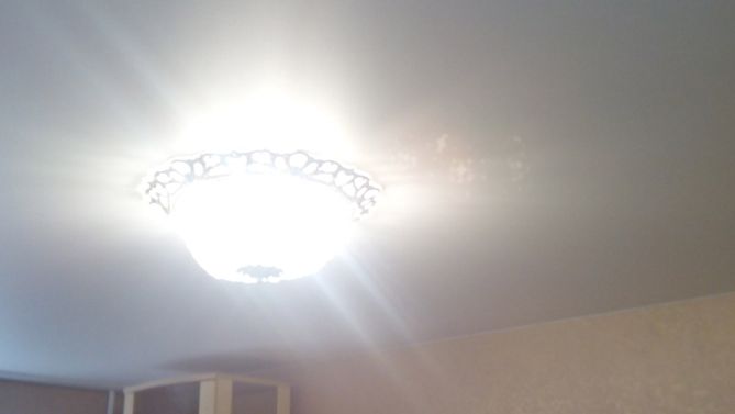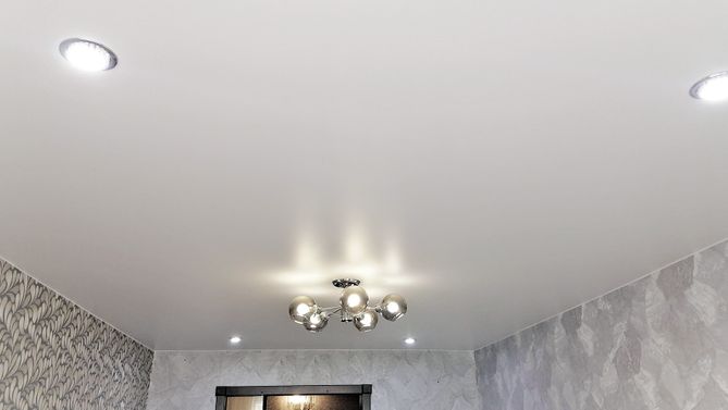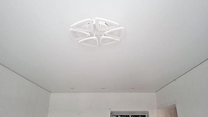 Бесшовный сатиновый натяжной потолок в гостиную 16,5 м2