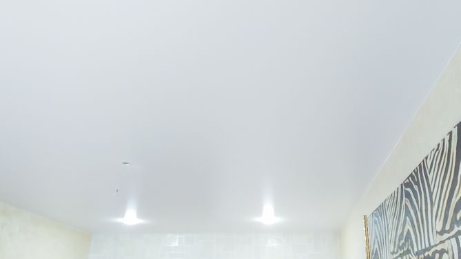 Бесшовный глянцевый натяжной потолок в гостиную 17,8 м2