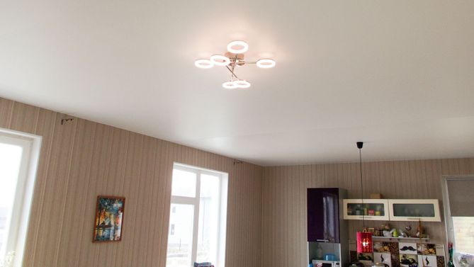 Сатиновый натяжной потолок в деревянном доме 42,6 м2