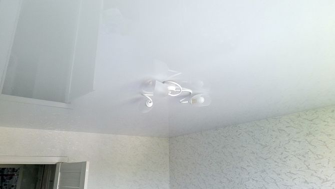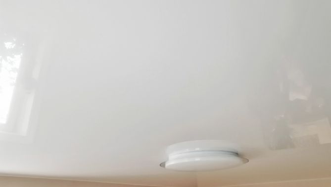 Бесшовный глянцевый натяжной потолок в деревянном доме 20,3 м2