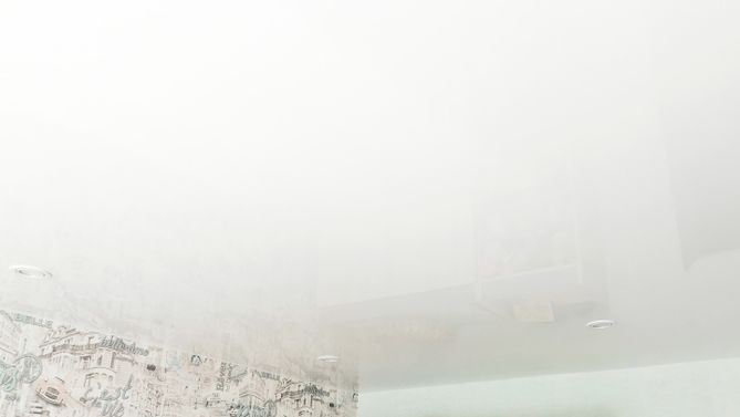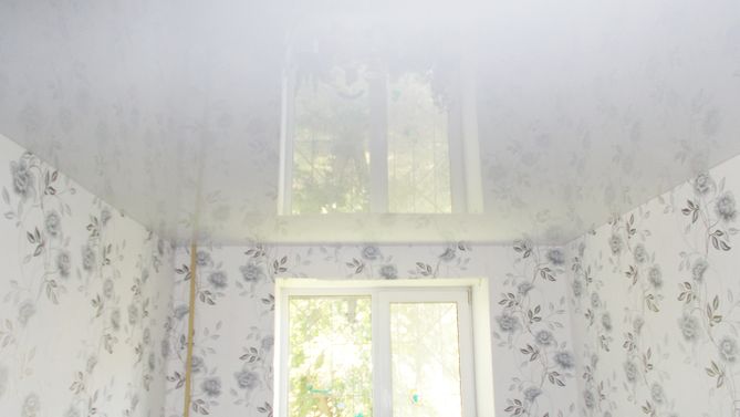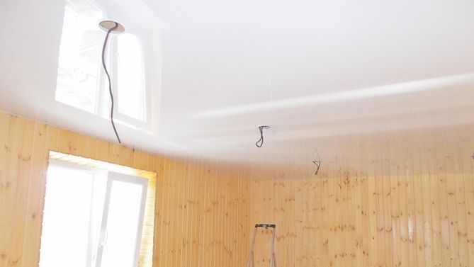 Глянцевый натяжной потолок в деревянном доме 21,5 м2