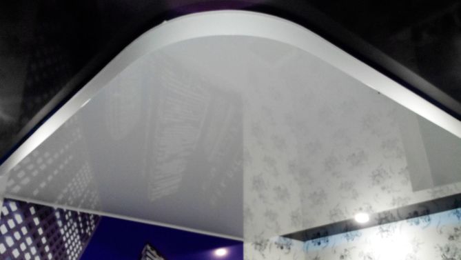 Двухуровневый глянцевый натяжной потолок 20,4 м2 в спальне с подсветкой