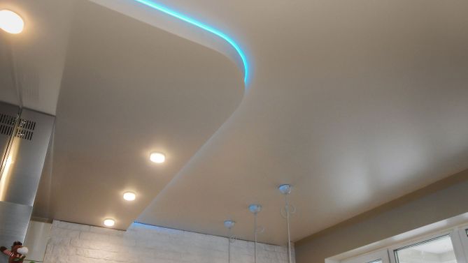 Двухуровневый сатиновый натяжной потолок 28,7 м2 на кухне с подсветкой