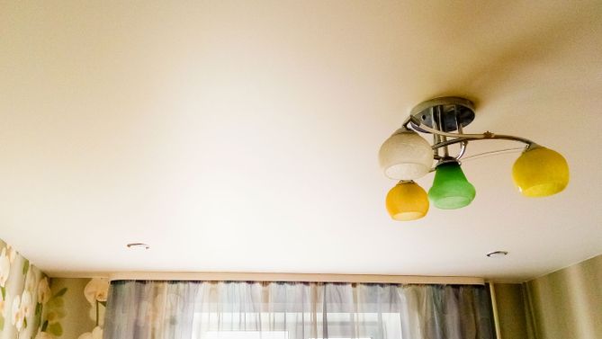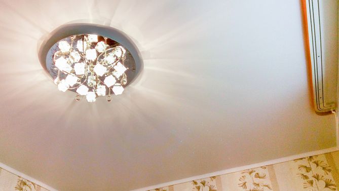 Бесшовный сатиновый натяжной потолок в деревянном доме 15,4 м2
