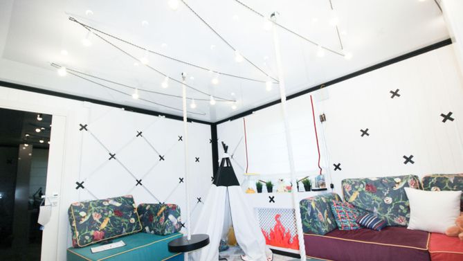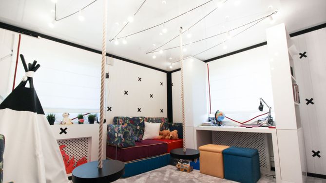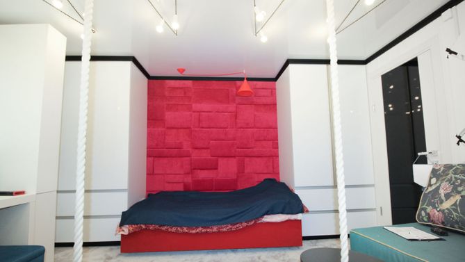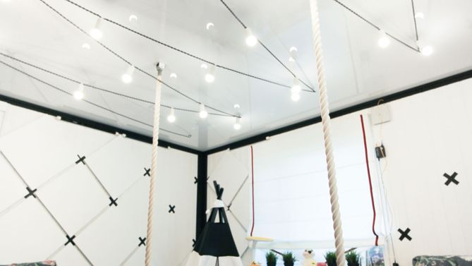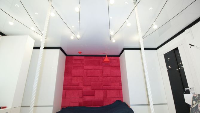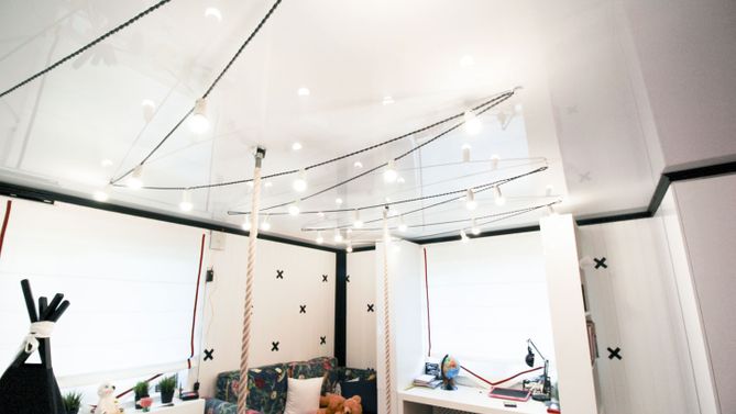 Компания Випсилинг установила нам замечательный натяжной потолок, он такой глянцевый, хорошо вписался в интерьер этой комнаты, этой глянцевой мебели. Я думаю, что он достаточно прочный, и, учитывая, что это детская комната, он выдержит любые испытания и прослужит долго, я думаю, это хороший потолок!