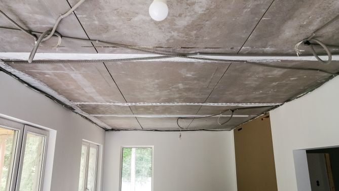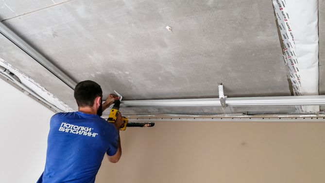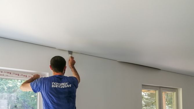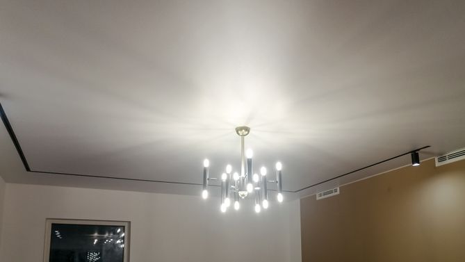 Монтаж потолка в гостиной 30 м2, полотно VISP M9001 (3.50)