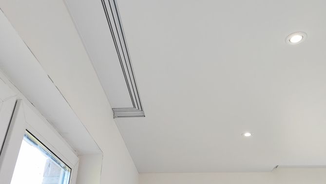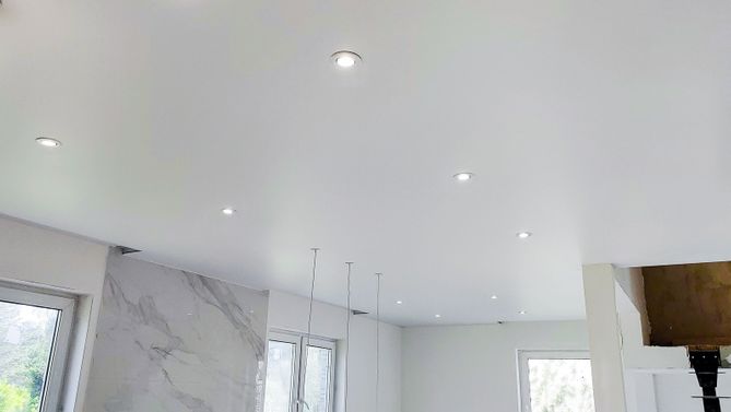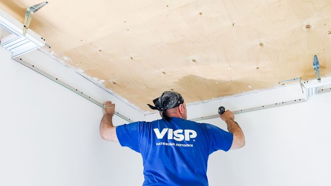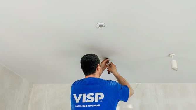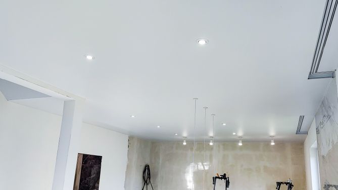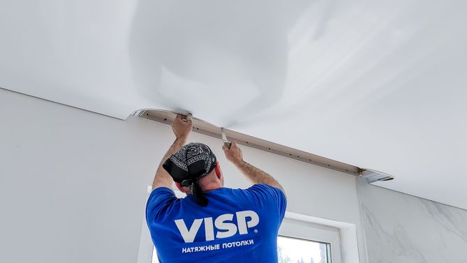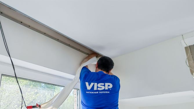 Монтаж потолка в гостиной 27 м2, полотно VISP M9001 (4.35)