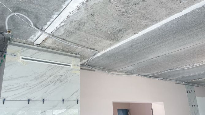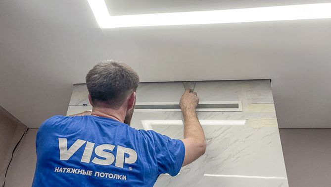 Монтаж потолка в гостиной 32 м2 с использованием пленки VIPCEILING серии MONLANGE M9001 (3.80)