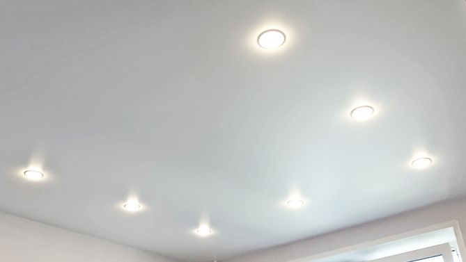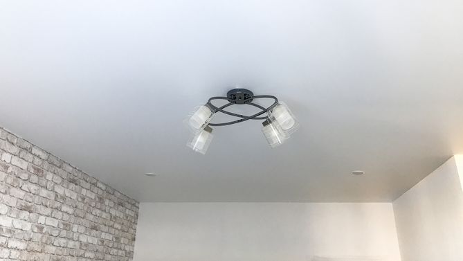 Бесшовный глянцевый натяжной потолок в гостиную 18,5 м2