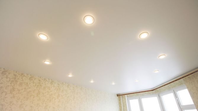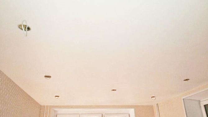 Бесшовный сатиновый натяжной потолок в деревянном доме 19,9 м2