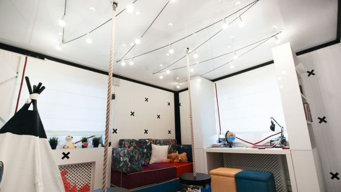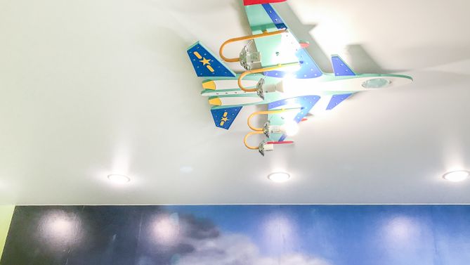 Бесшовный сатиновый натяжной потолок в детскую 16,6 м2