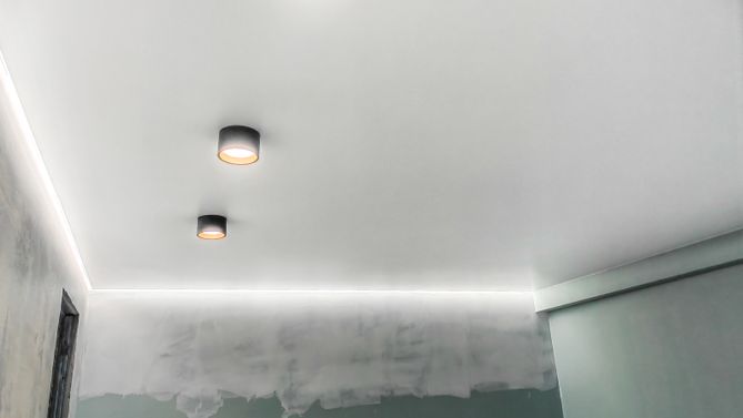 Монтаж потолка в гостиной 40 м2, полотно VISP M9001 (4.90)