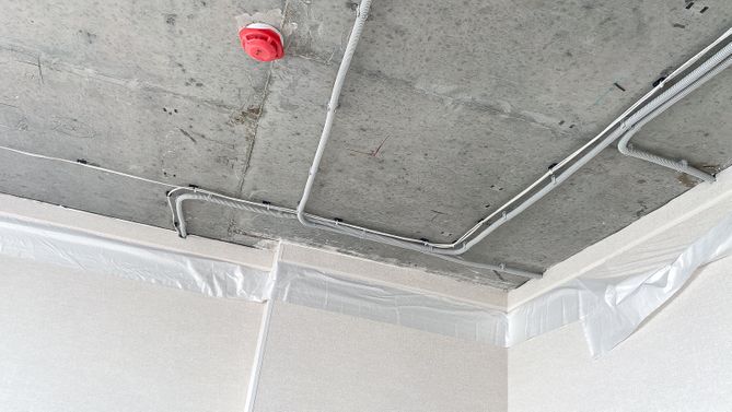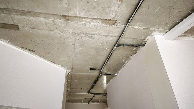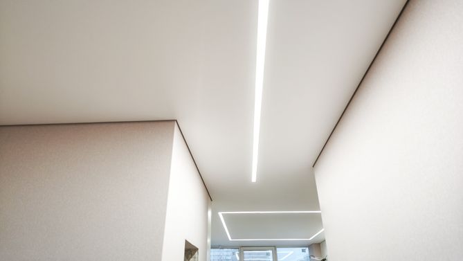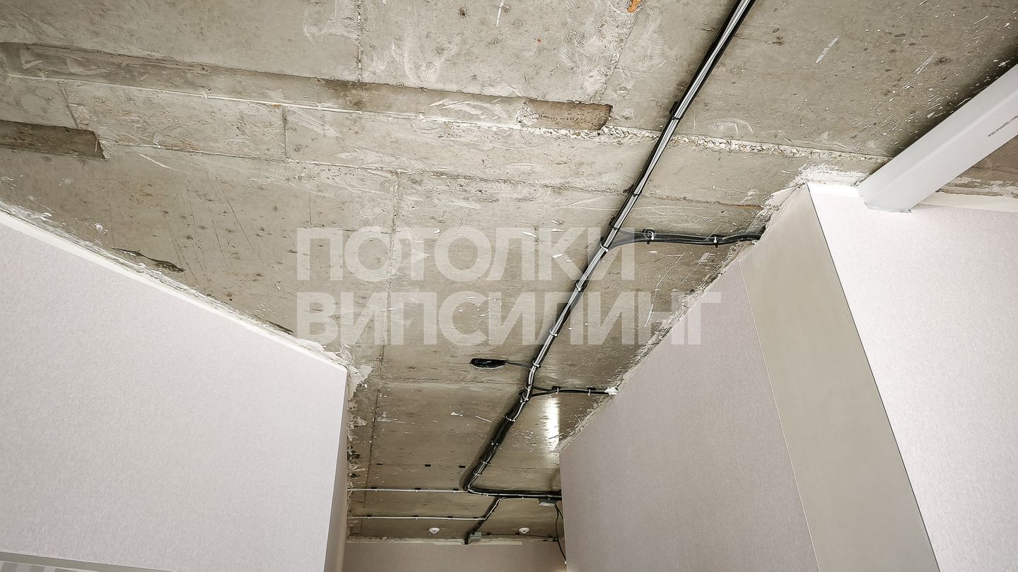Натяжное полотно скрывает электропроводку, коммуникации и дефекты базового потолка