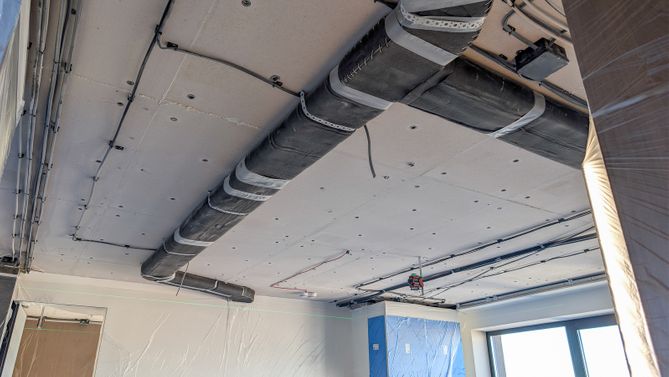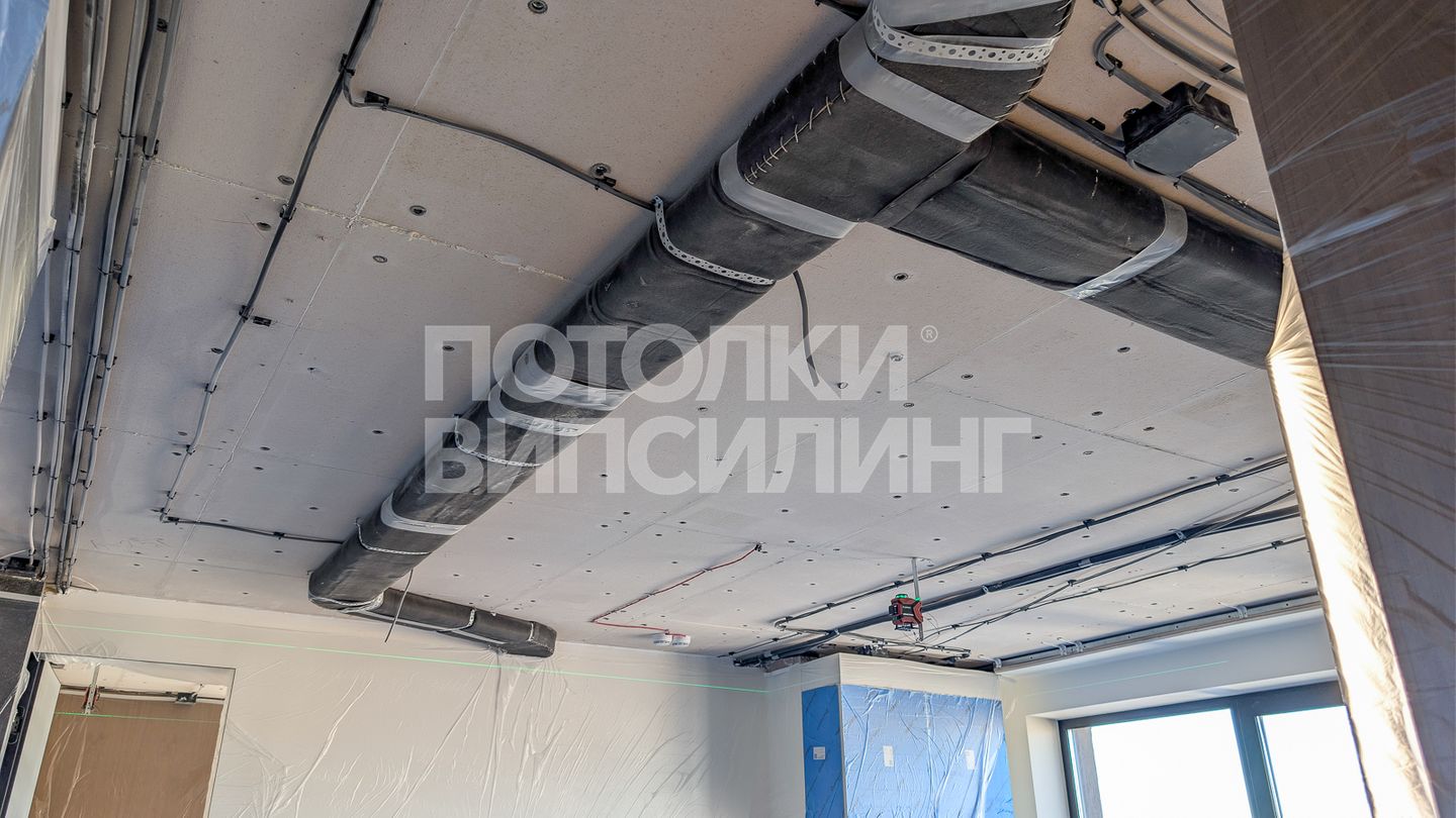 Натяжное полотно скрывает электропроводку, коммуникации и дефекты базового потолка