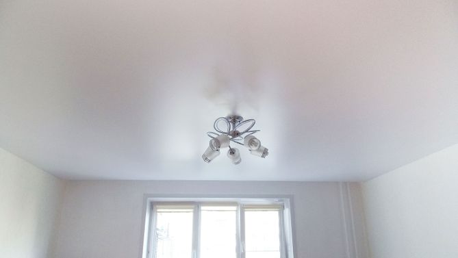 Бесшовный сатиновый натяжной потолок в гостиную 18,6 м2