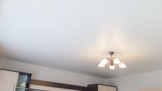 Бесшовный сатиновый натяжной потолок в гостиную 18,6 м2
