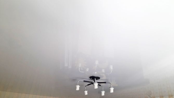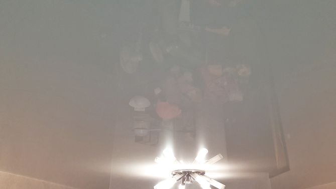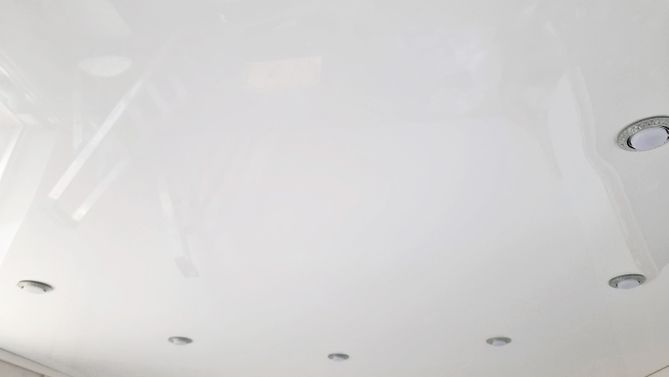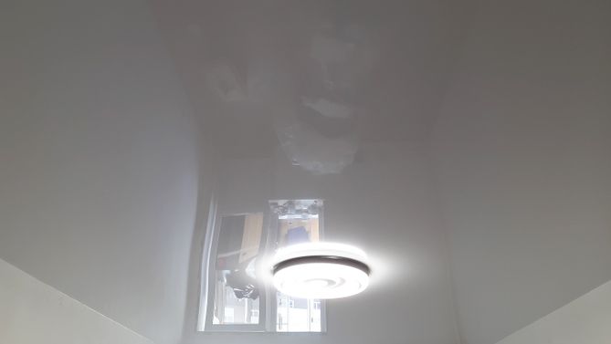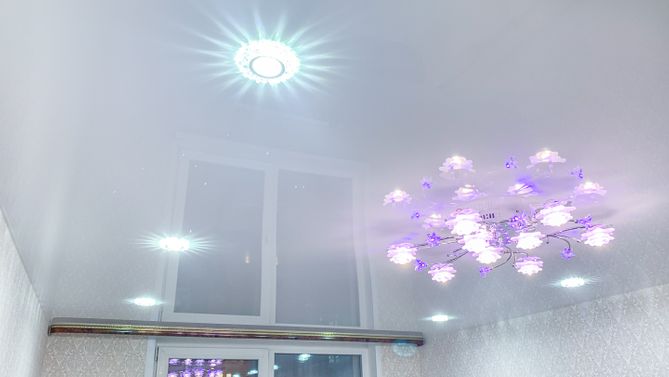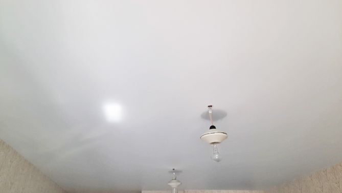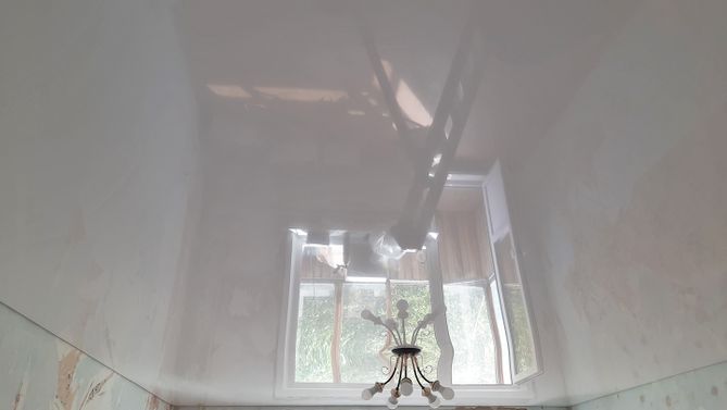 Бесшовный глянцевый натяжной потолок в гостиную 16,6 м2