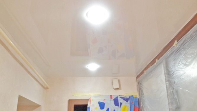 Глянцевый натяжной потолок в деревянном доме 22,9 м2