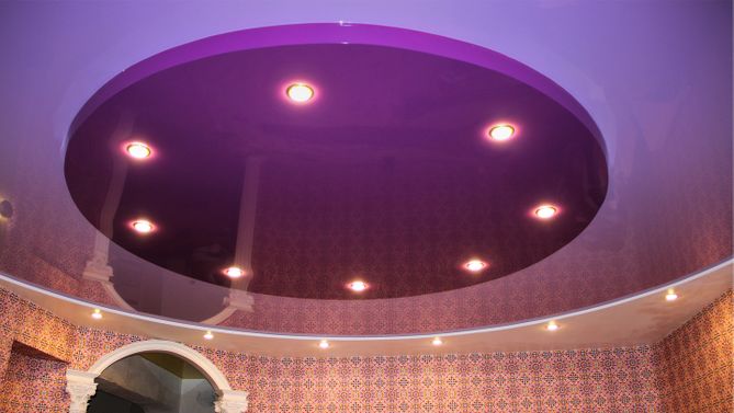 Двухуровневый глянцевый натяжной потолок в гостиную 14,4 м2