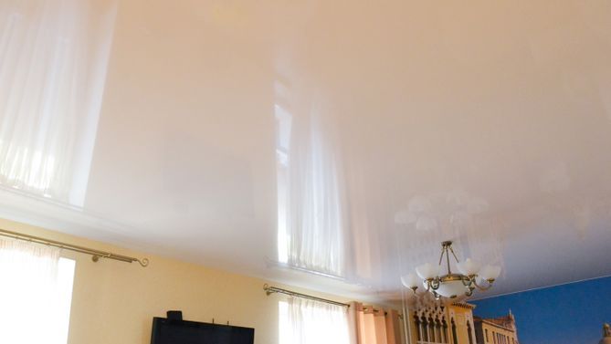 Бесшовный глянцевый натяжной потолок в гостиную 16,8 м2