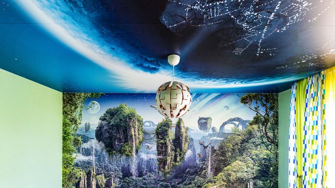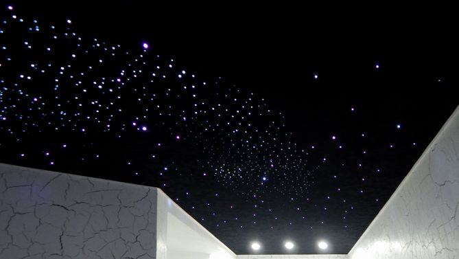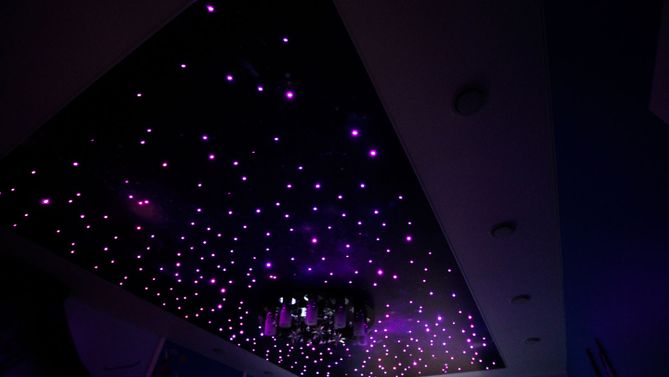 В рамках программы «Школа ремонта», компания Випсилинг установила нам такой вот замечательный натяжной потолок с принтом звездное небо и такой вот совершенно замечательной подсветкой, от которой дети в полном восторге.