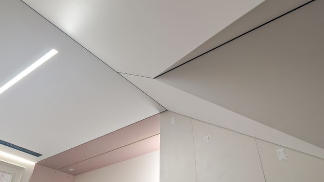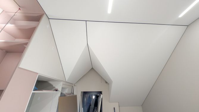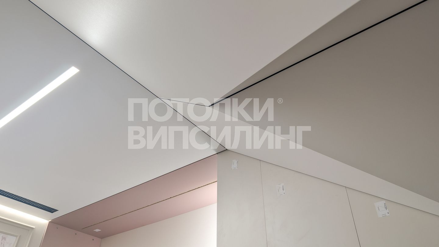 Также он может быть использован при обходе колонн, для зонирования помещения, при изменении плоскости натяжного потолка на мансардах, при оформлении перехода уровня или совмещении в одном помещении разных фактур и цветов полотен.