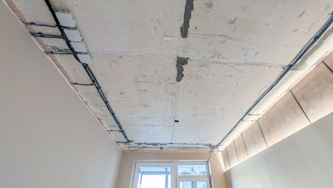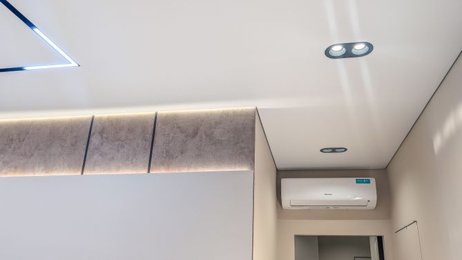 Натяжное полотно скрывает электропроводку, коммуникации и дефекты базового потолка