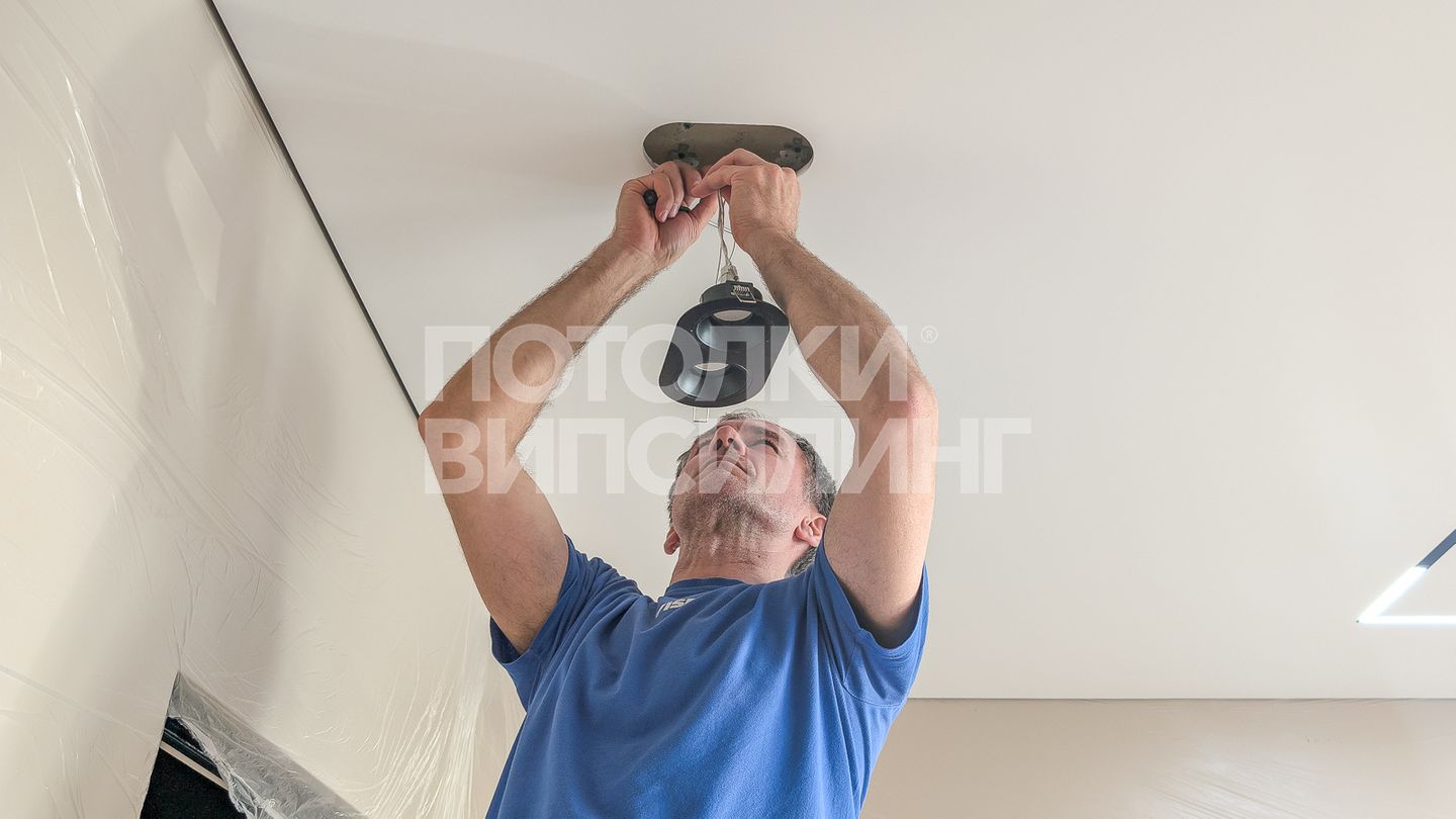 Для крепления люстры на планке устанавливается специальная конструкция на базовом потолке - закладная. При необходимости люстру можно установить в любом месте натяжного потолка.