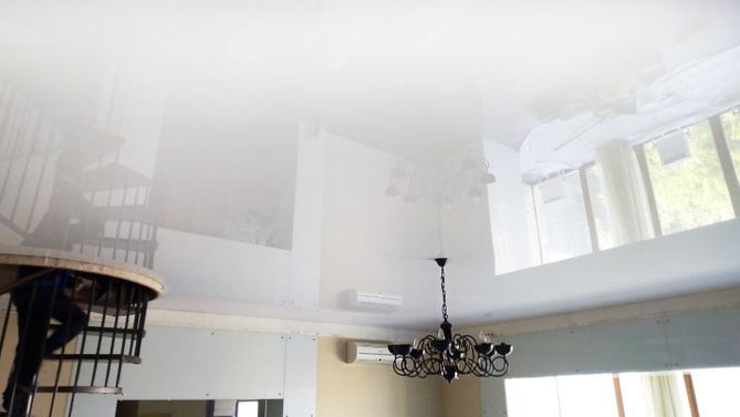 Бесшовный глянцевый натяжной потолок в гостиную 16,5 м2