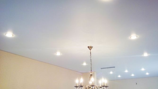 Бесшовный глянцевый натяжной потолок на кухню 10,6 м2