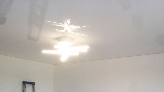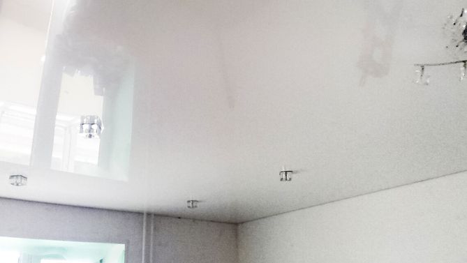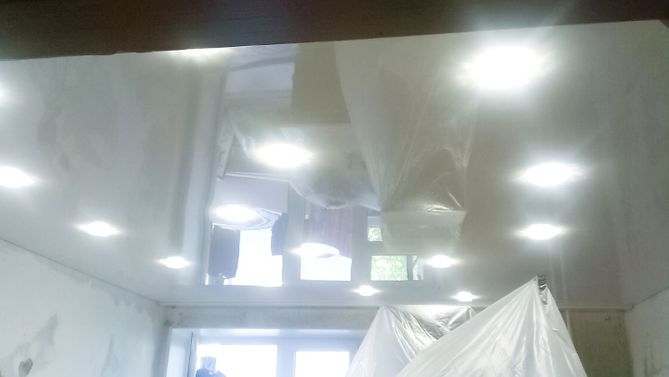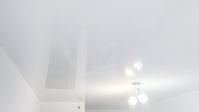 Бесшовный глянцевый натяжной потолок в гостиную 17,9 м2