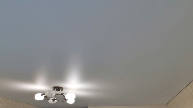 Бесшовный сатиновый натяжной потолок в гостиную 23 м2