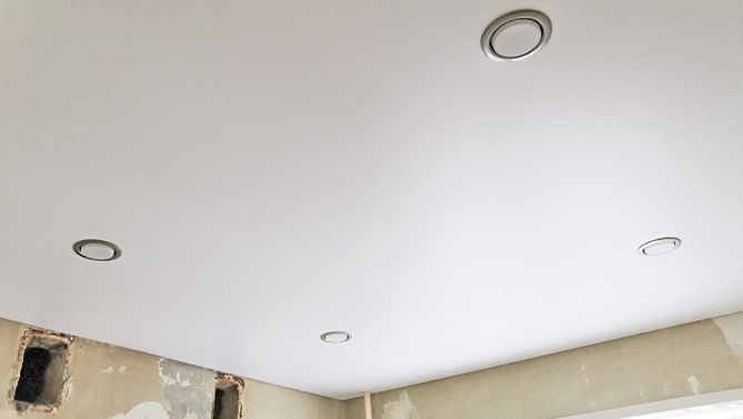 Монтаж потолка в гостиной 22 м2, полотно VISP S9020 (4.90)